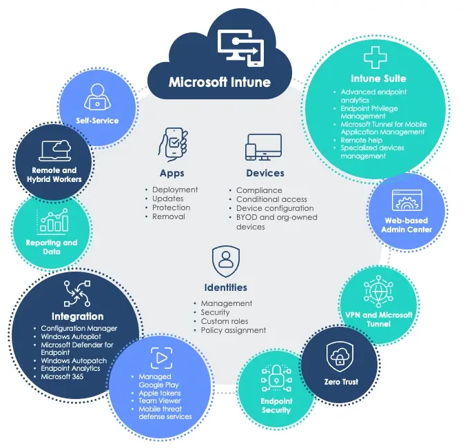 Intune integrates with other Microsoft tools and adds value with features like policy management, endpoint analytics, device compliance, remote support, cloud-based administration, device provisioning, software deployment, and cybersecurity tools.